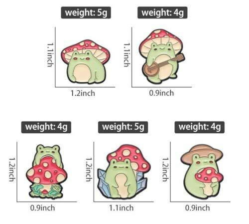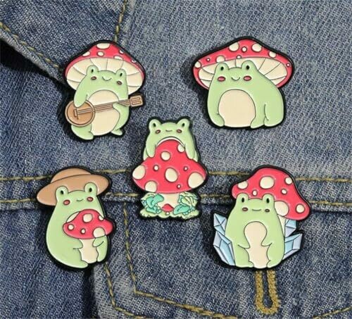 - Frog Pins Style: Have you ever seen enamel brooches with frogs and mushrooms? If not, let me show you. The combination of various funny frog poses and mushrooms creates a scenic area. The beautiful color scheme is just right. The rich and colorful design makes it easy to match most party attire and helps you easily create a unique and lovely elegant look! It's so cute!