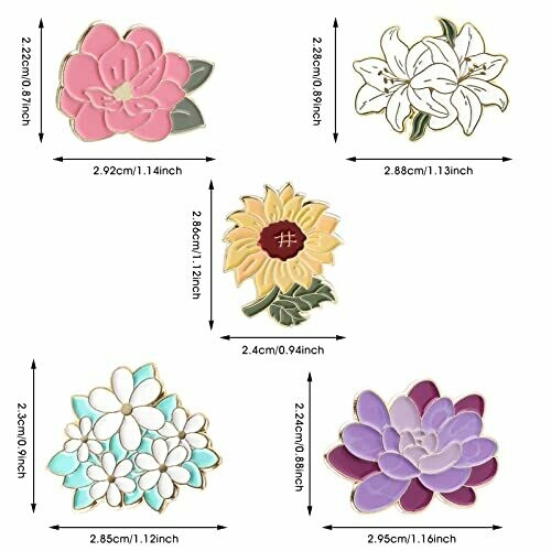 • Suitable size: Enamel pin set includes 5 colors styles. 5 Small white flower: 1.12*0.9in; Lily flower: 1.13*0.89in; Red flower: 1.14*0.87in; Purple flower: 1.16*0.88in; Sunflower: 1.12*0.94in. These aesthetic pins are a versatile size, whether it's decorating a garment or a backpack.