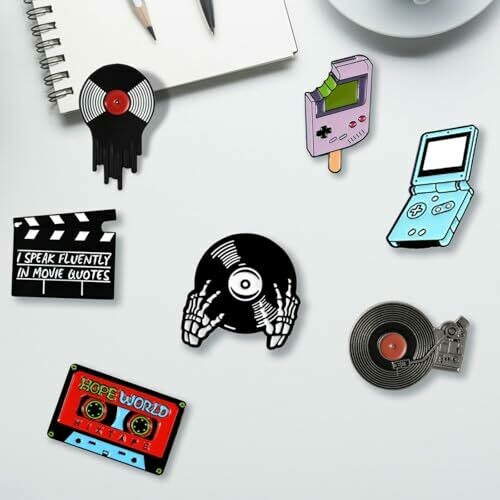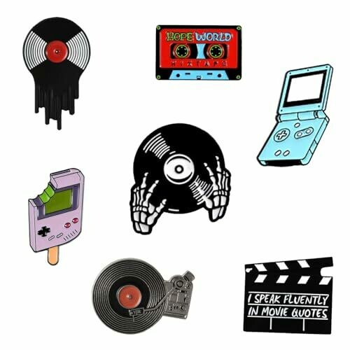JDFHFGB 7 Pcs Vintage Pop Culture Brooch Set - Retro Record Player, Cassette Tape & Skeleton Hand Enamel Pins, 80s 90s Brooch Nostalgia Badges for Jacket, Backpack, Hat This 7-piece vintage music-themed brooch set includes retro designs like skeleton hands, record players, and cassette tapes, made with enamel for lasting color Suitable for adding a nostalgic touch to jackets, backpacks, hats, or shirts Lightweight and sturdy, these decorative pins work as party favors or collectibles for music lovers Each set offers mix-and-match styles in black/gold tones, with secure clasp backings for easy wear It makes an ideal for birthdays, anniversaries, graduations, Xmas present, or just to show someone special you care A thoughtful gift option or everyday accessory