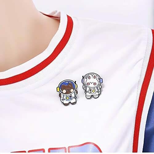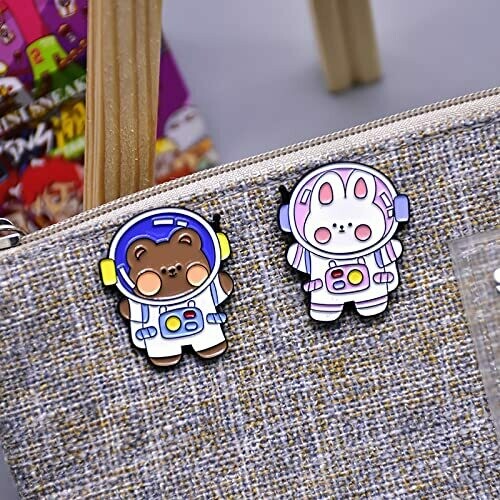 Adorable cartoon animal enamel pins featuring space bear and rabbit designs. Made of galvanized metal and enamel, perfect for decorating backpacks, clothing, hats, and bags. Great for gifting to children or friends who appreciate creative and funny accessories.