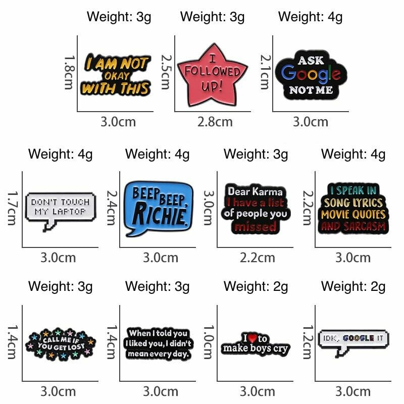 Elevate your style and mood by choosing an antisocial meme theme enamel pin from this funny collection of over 10 different comic and sarcastic enamel pin badges! Designed to elicit a giggle in whoever reads them, each pin adds a touch of your antisocial personality to any outfit or accessory. Crafted with durable materials, the badge you select is built to last and withstand daily wear. Perfect for expressing your unique perspective and sharing a dose of sarcasm, cynicism, and wit with others. Whether you're looking to make a statement or add a sassy touch to your look, this diverse selection of creatively devised enamel pins offers endless possibilities. Grab yours today and let your accessories do the talking!