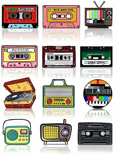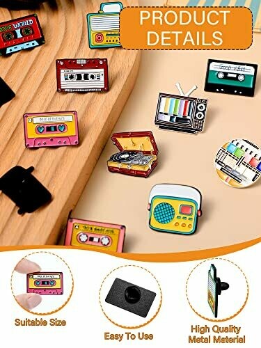 Get 12 handmade retro 90s style pins featuring vintage radios and tapes. Made of strong zinc alloy, these pins are durable and vibrant. Attach them to clothing or bags to show off your unique taste. Perfect as a gift for music and vintage lovers.